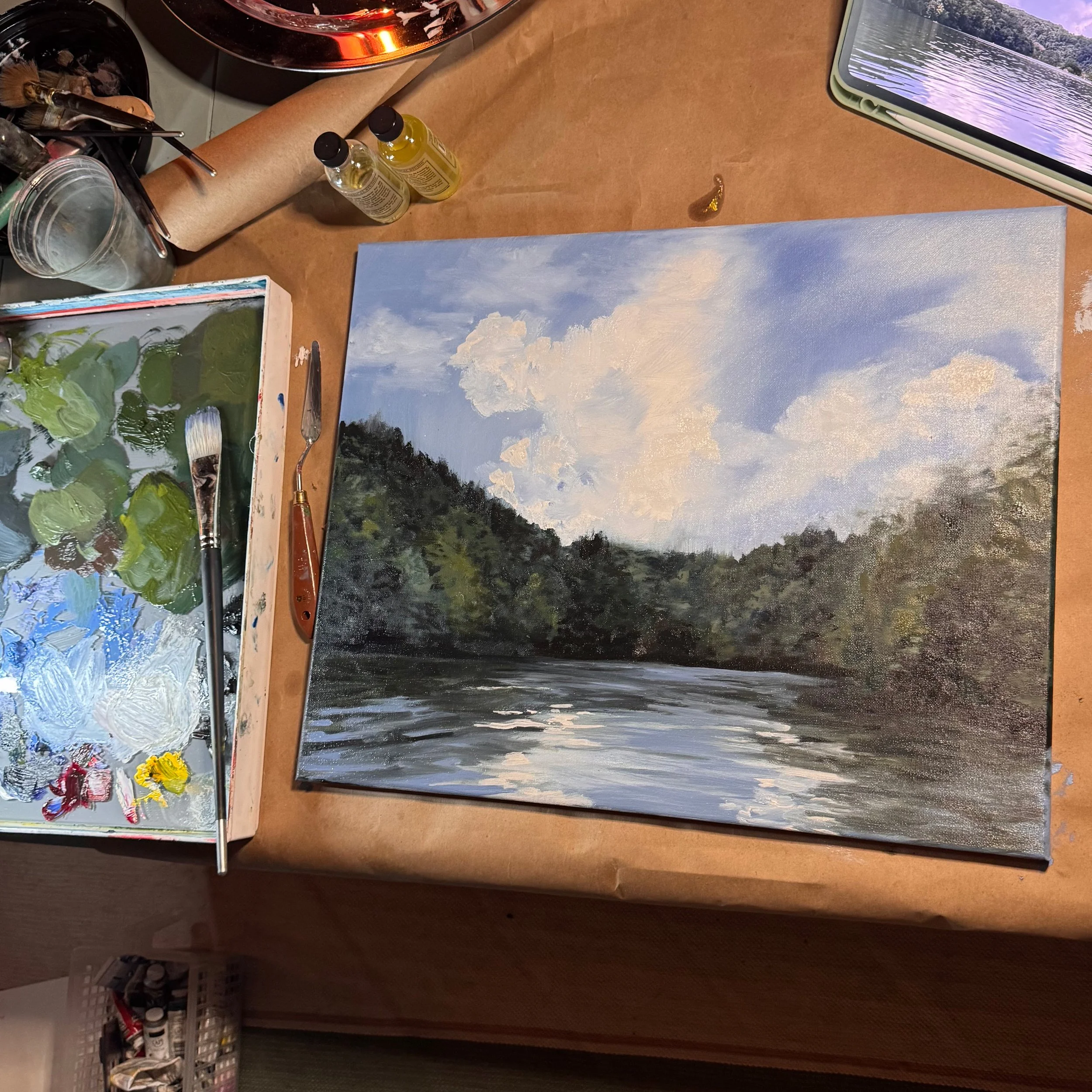 A scene from a recent trip kayaking. I’m obsessed with learning how to paint clouds and water reflections.