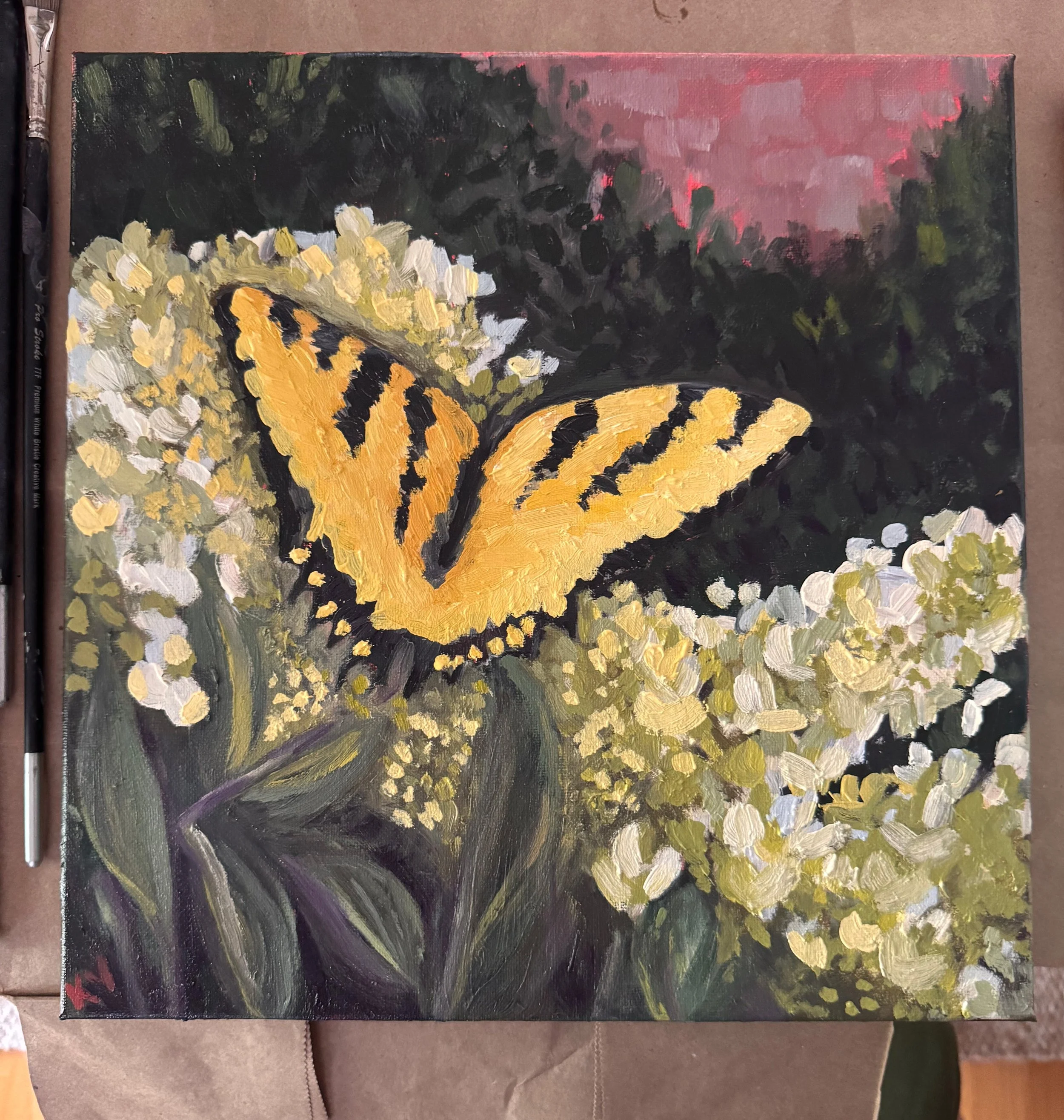 We have a butterfly bush and it attracts these huge yellow butterflies (eastern tiger swallowtail). I saw the same one many days in a row that was as large as my entire hand! I painted this in honor of that butterfly that I named “Big Guy,” and in honor of all the other butterflies that visited this summer.